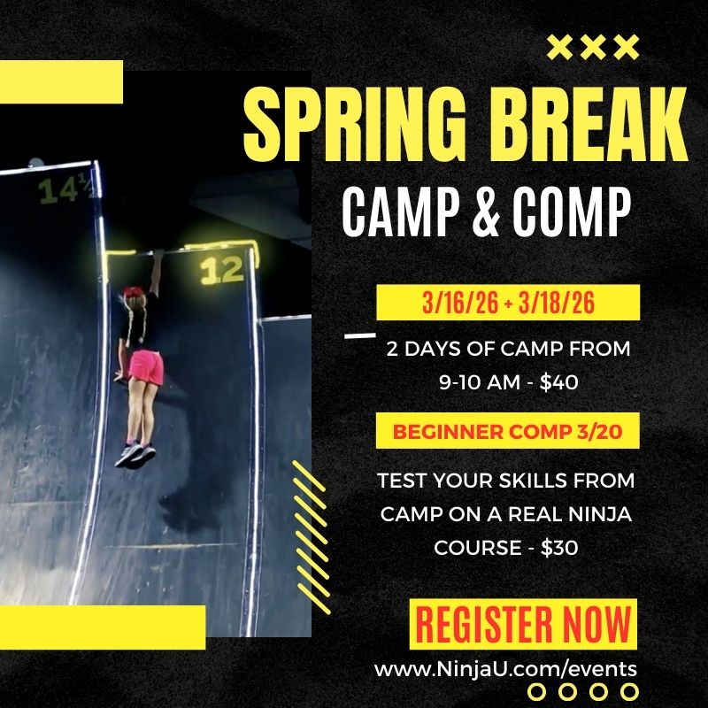 Keep your ninja moving and learning over spring break! Our Spring Break Ninja Camp includes two 1-hour training sessions focused on building skills, confidence, and having fun on real ninja obstacles.